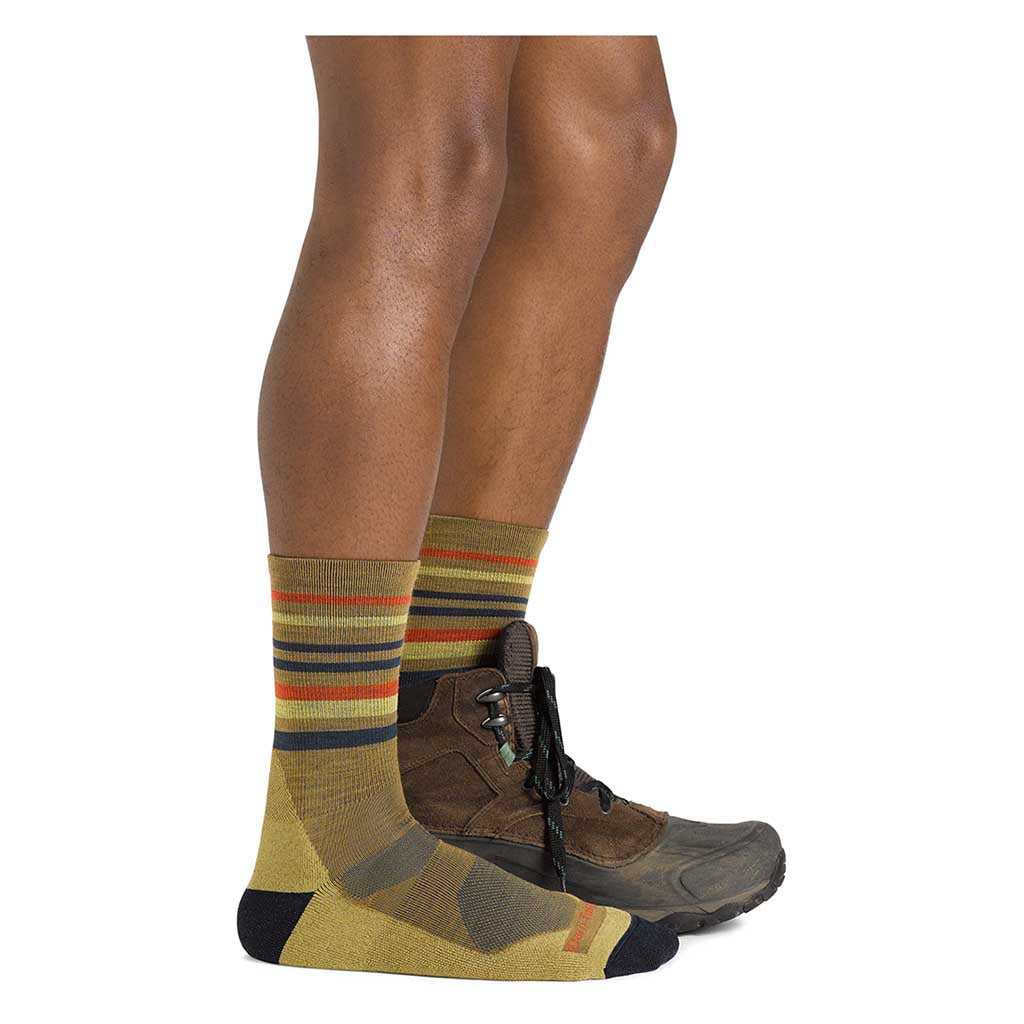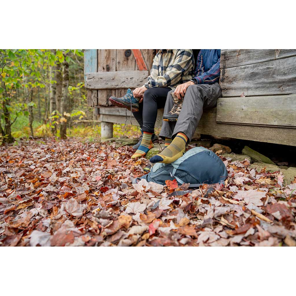 Der Name sagt es schon - die Fastpack wurde für leichte Bewegungen und große Distanzen entwickelt. Sie ist eine abgespeckte, trailtaugliche Version der beliebtesten Wandersocke von Darn Tough, die von Wanderern, Wildcampern und Wochenendausflüglern gleichermaßen geschätzt wird. Mit ihrer leichten Dämpfung unter den Füßen, der Unterstützung des Fußgewölbes gegen Ermüdung und dem erweiterten Schutz der Achillessehnen ist sie für den Komfort unterwegs konzipiert - egal, ob Sie bei Tagesanbruch die Schuhe schnüren oder das letzte Tageslicht zurück zum Camp jagen. Eine atmungsaktive Merinowollmischung hält die Füße kühl, trocken und geruchsfrei, während die Mikro-Crew-Höhe stiefelfreundlich und schmutzabweisend bleibt. Und mit dem eleganten Streifen, der auf die Performance der Socke verweist, fühlt sie sich nicht nur gut an, sondern sieht auch gut aus.