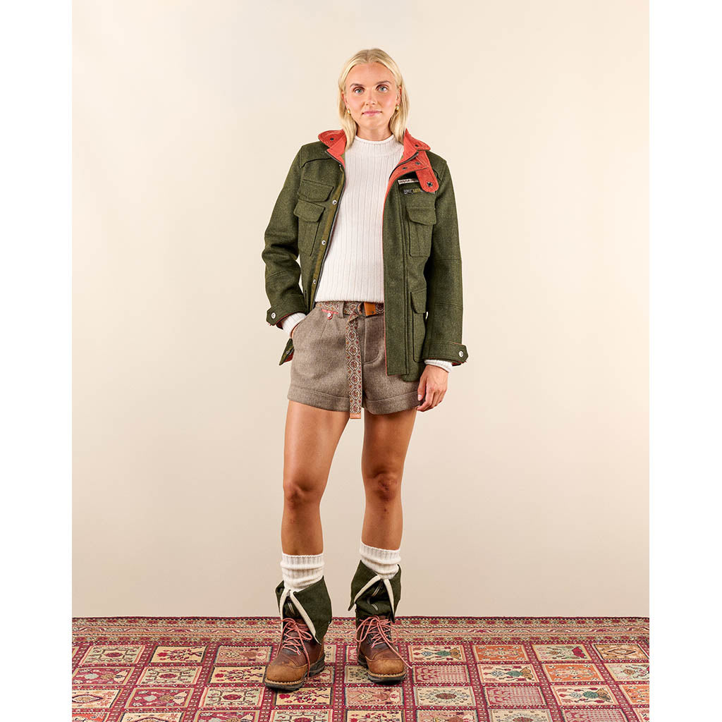 Die Lodenjacke aus Wolle ist eine Ikone der österreichischen Alpen, und Amundsen hat sie als luxuriösen Damen-Feldmantel für ganzjährigen Schutz in den rauesten Umgebungen neu interpretiert. Die doppelt gewebte Merinowolle von Leichtfried of Austria ist herrlich warm und winddicht, dicht gewebt und wasserabweisend behandelt, sodass Wasser abperlt. Akzente aus Cord und gewachster Baumwolle verleihen ihr einen Hauch von Landhausstil, und mit dem verstellbaren Bund können Sie die Passform für eine schmeichelhafte Silhouette zuschneiden. Die zeitlos elegante Reisejacke eignet sich hervorragend zum Schießen und für die Pirsch, denn sie verfügt über Patronentaschen mit Knöpfen, geräuscharmen Stoff und zahlreiche Fächer für GPS/Funkgerät, Messer und Werkzeug.