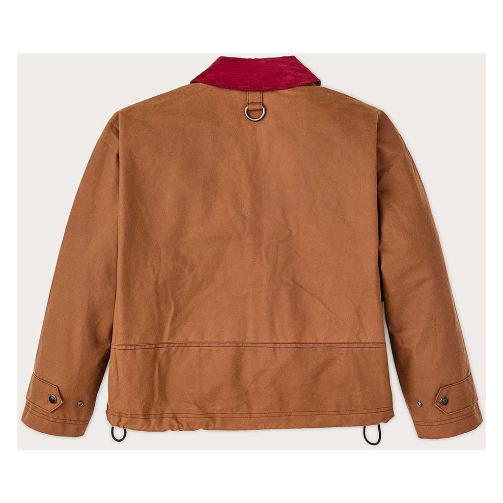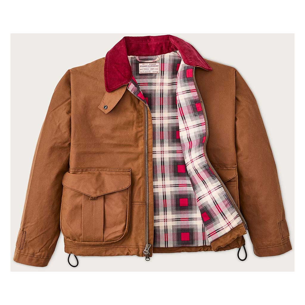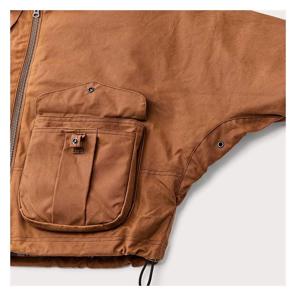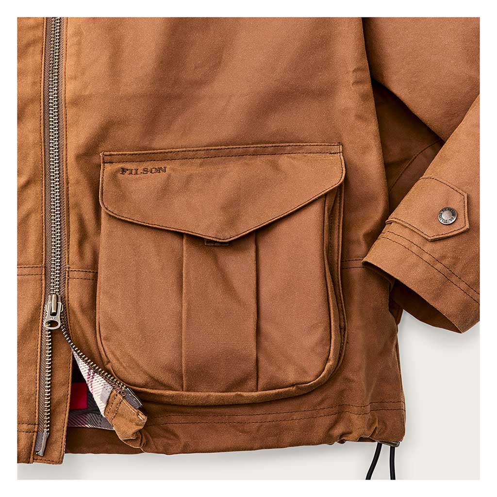 Die Women's Short Work Jacket basiert auf einer alten Fischerjacke aus den Archiven von Filson. Sie wurde aus geöltem Shelter Cloth gefertigt, das leichter und flexibler ist als das berühmte, schwere Tin Cloth, und hat einen kürzeren, hüftlangen Schnitt, der ihr einen moderneren Look verleiht. Abgesehen davon wurden jedoch alle praktischen Details beibehalten, die das ursprüngliche Design so beständig gemacht haben. Die nahtlose Schulterkappenkonstruktion verhindert, dass Wasser eindringen kann, und die großen, erweiterbaren Cargotaschen bieten Platz für alle wichtigen Utensilien und mehr. Die gesamte Jacke ist mit dem gleichen weichen, gebürsteten Baumwollflanell gefüttert, der auch bei den beliebten Alaska-Führerhemden zum Einsatz kommt, und hat ein buntes Futter im Jagdstil, das beim Öffnen des Reißverschlusses einen schönen Akzent setzt. Der mit einem Kordelzug verstellbare Saum ist eine Funktion, die von der Archiv-Jacke übernommen wurde und mit der Sie die Jacke bei aufkommendem Wind enger stellen können. Das ist das, was Filson am besten kann - traditionelle Arbeitskleidung in eine moderne Silhouette zu verwandeln.