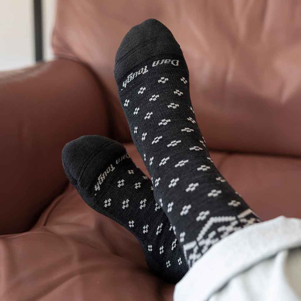 Wenn das Wetter knackig wird und die Strickwaren herauskommen, sollten Sie Ihre Füße nicht vergessen. Diese Socken sind von traditionellen Shetland-Mustern inspiriert und aus weicher, gepolsterter Merinowolle gestrickt. Sie versprühen echte Kaminfeuer-Energie - denken Sie an Skihütten, heiße Schokolade und neblige Bergwanderungen bei einer Kälte, die in der Nase beißt. Aber sie sind nicht nur zum Einkuscheln gedacht. Atmungsaktiv, kuschelig und mit Darn Toughs Trail-ready-Tech ausgestattet, sind sie auf einer schlammigen Wanderung genauso gut aufgehoben wie vor dem Kaminfeuer. Die Shetland Crew ist zeitlos, gemütlich und unaufdringlich robust - für Menschen, die ihre Abenteuer mit einer Portion Komfort genießen.
