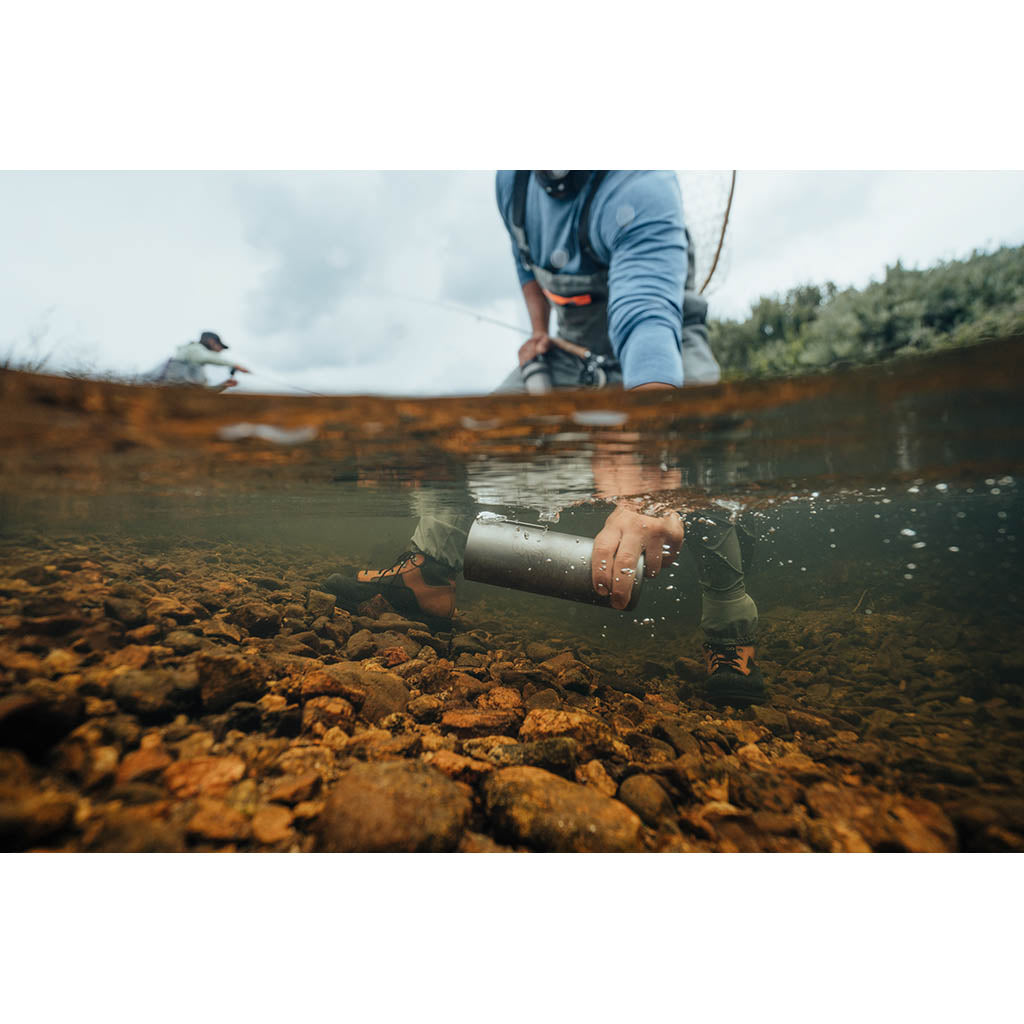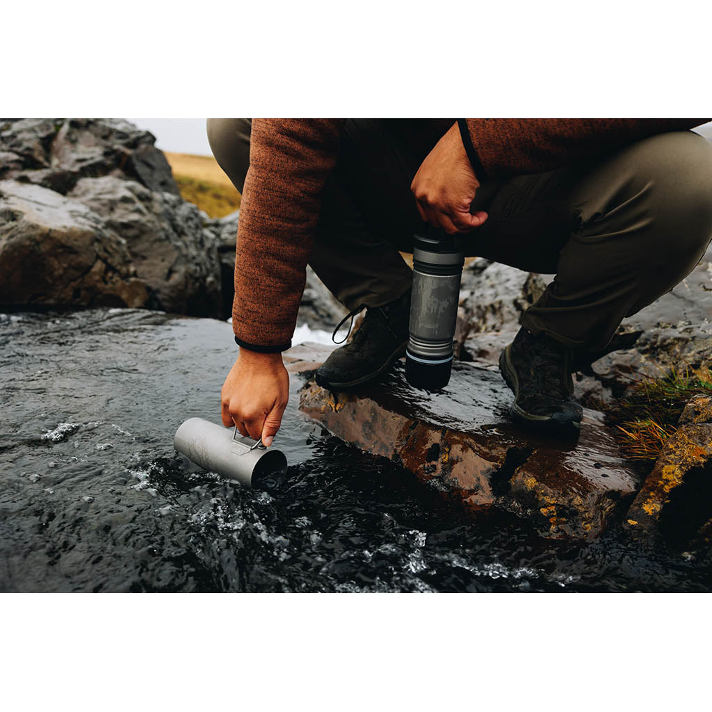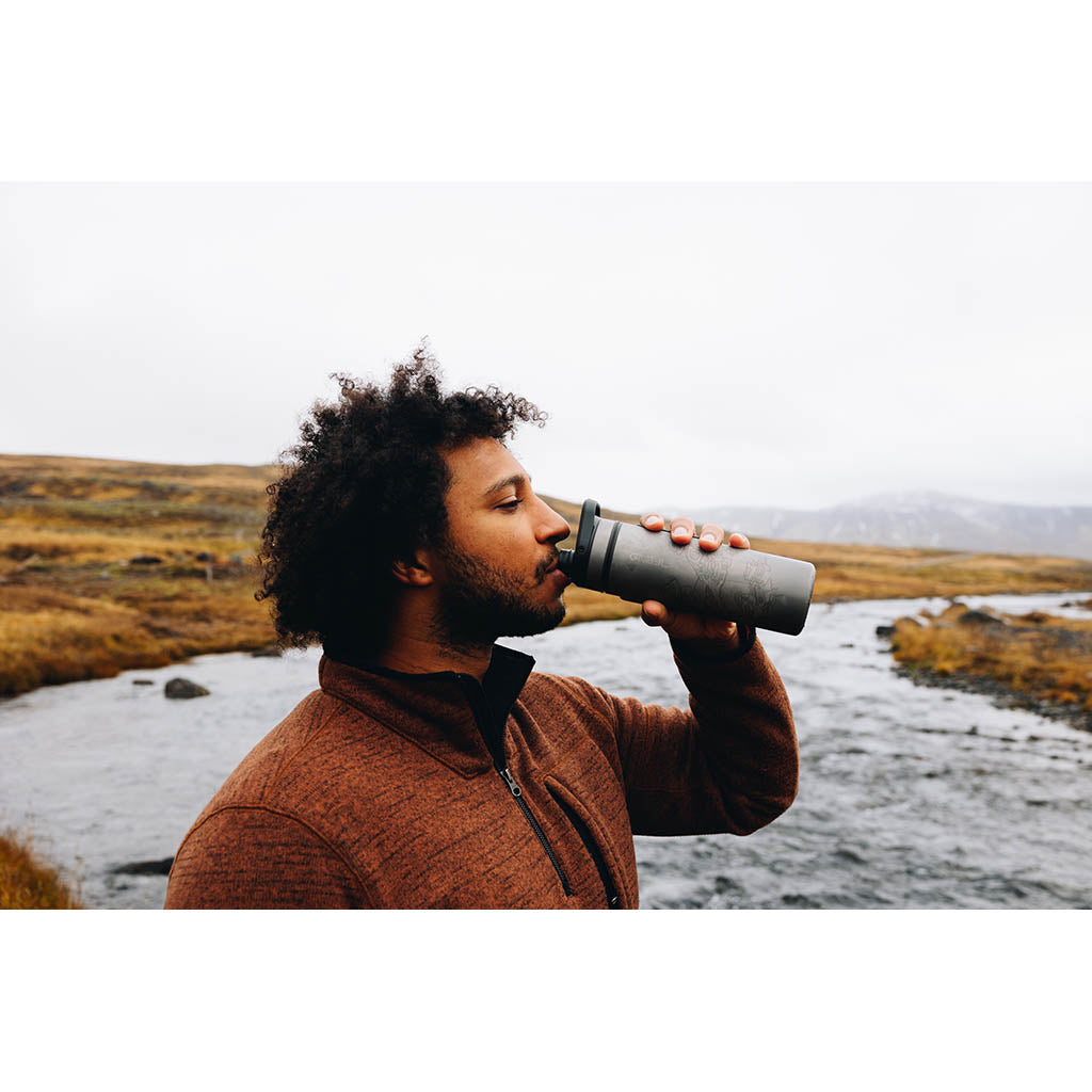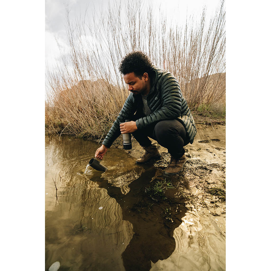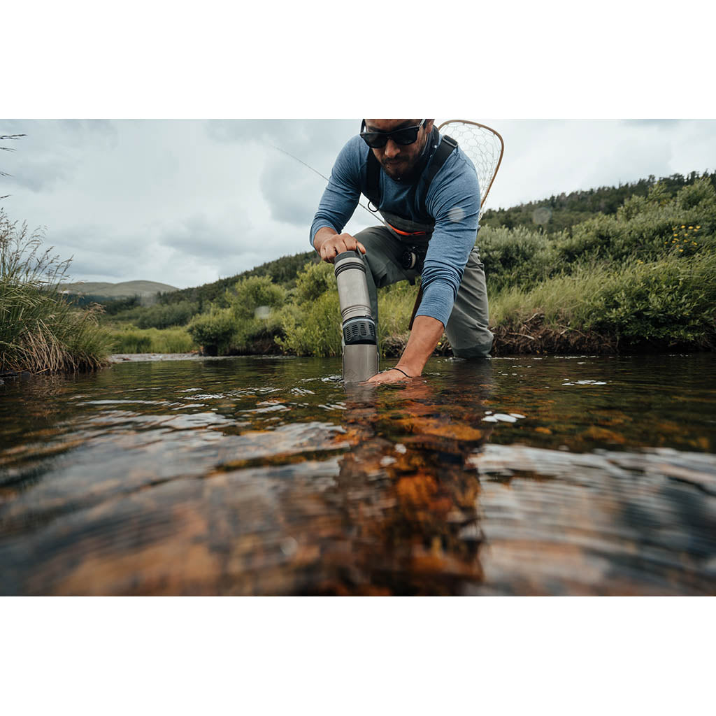 Die Lösung von GRAYL war eine Reihe von tragbaren, kompakten und einfach zu verwendenden Flaschenreinigern. Befüllen, drücken und trinken. Das Design funktioniert auf allen Kontinenten, egal ob Sie Wasser aus trüben Flüssen, unübersichtlichen Wasserhähnen oder stehenden Seen schöpfen. Er nutzt Ihr eigenes Körpergewicht, um das Wasser durch einen zweistufigen Reiniger zu drücken. Das bedeutet, er ist schnell - wirklich schnell. Außerdem bietet er vollständigen Schutz vor allen im Wasser vorkommenden Krankheitserregern, sogar vor Viren, und er sorgt dafür, dass das Wasser auch gut schmeckt, indem er Chemikalien, Schwermetalle und Mikroplastik herausfiltert. Sie werden nie wieder Wasser in Flaschen kaufen müssen. Kurz gesagt, es ist der Heilige Gral der Wasseraufbereitung.