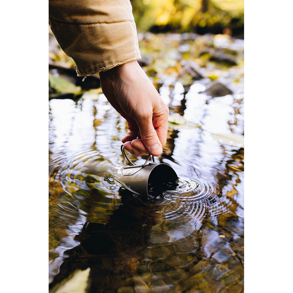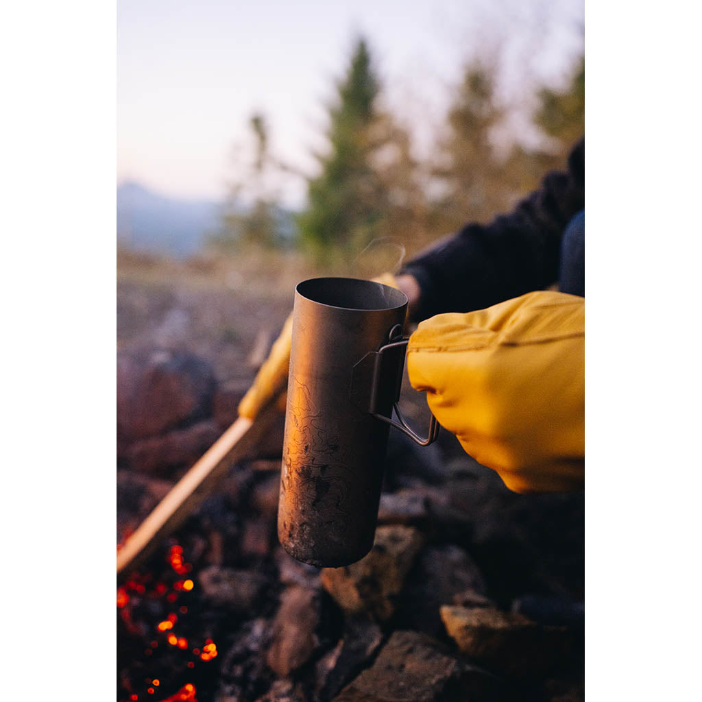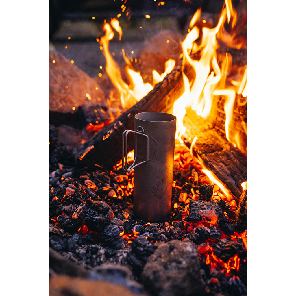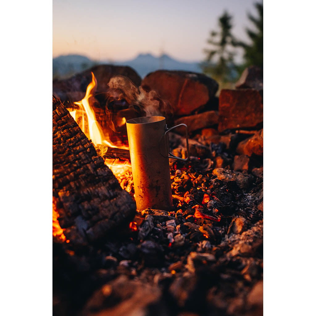 - Äußerer Ti Cup kann zum Erhitzen von Wasser und zum Kochen von Essen in der Nähe eines Feuers oder auf einem Campingkocher verwendet werden