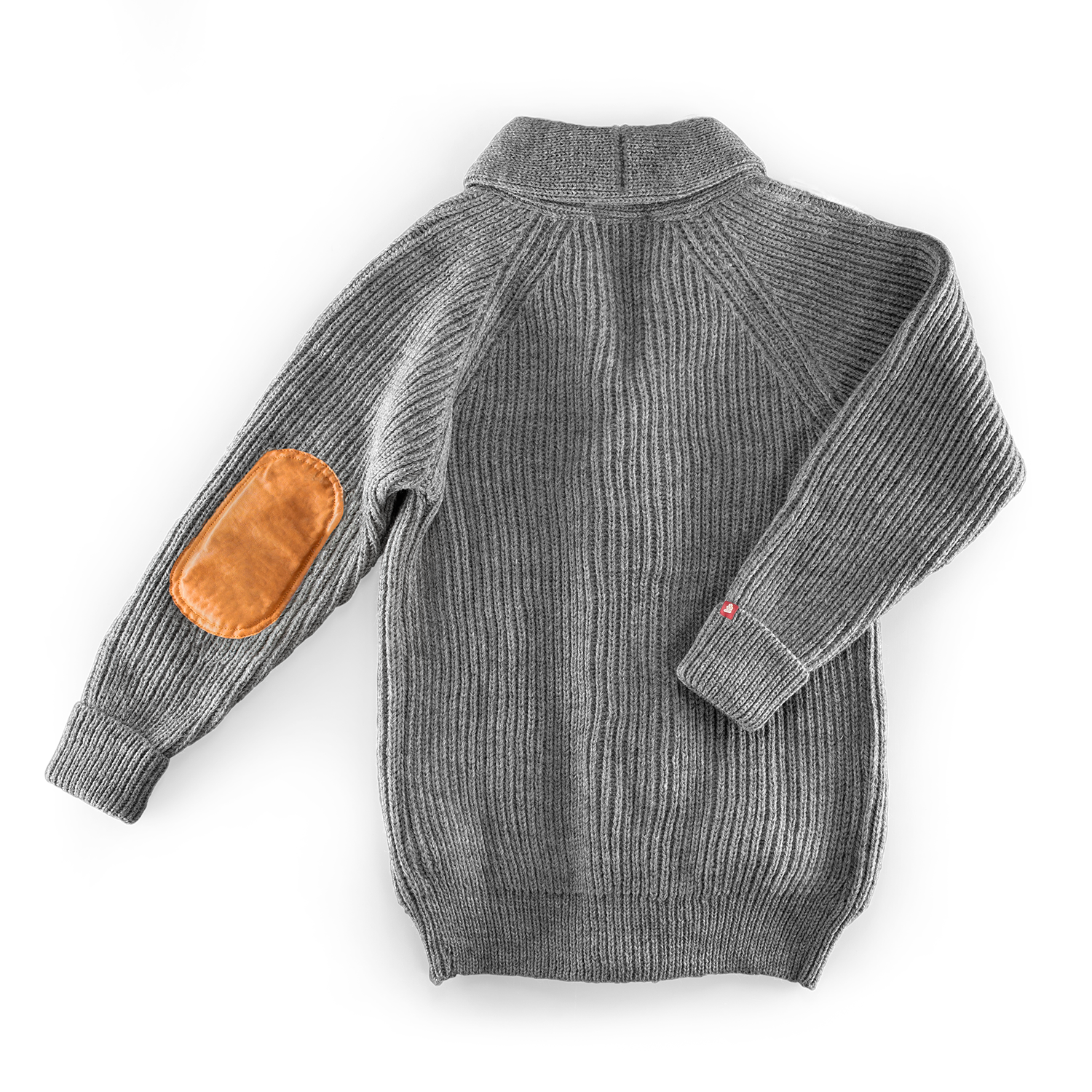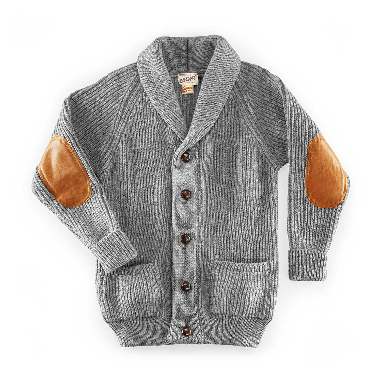 Diese klassische Strickjacke mit Schalkragen verleiht Ihrem Stil einen entspannten Look, mit einem neuen Twist... &SONS haben Canada Tan Kalbsleder-Ellbogenpatches mit Doppelnähten hinzugefügt.