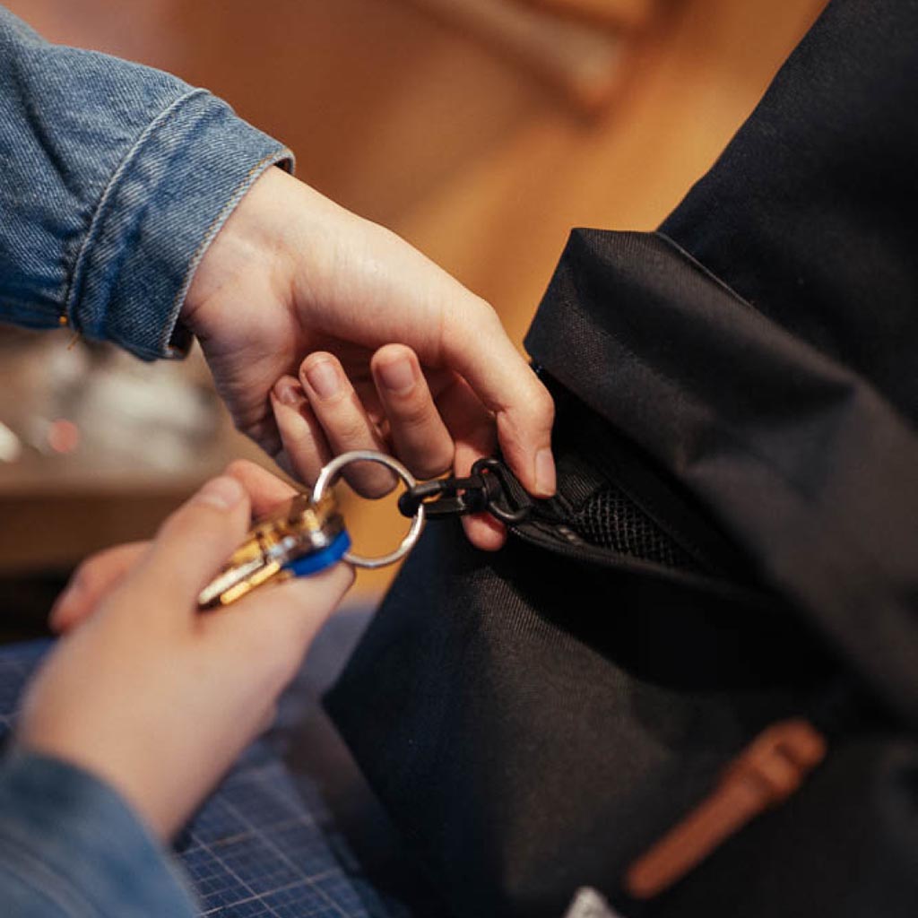 • Ein Organizer auf der Vorderseite und ein Schlüsselclip helfen Ihnen, kleinere Gegenstände unter Kontrolle zu halten