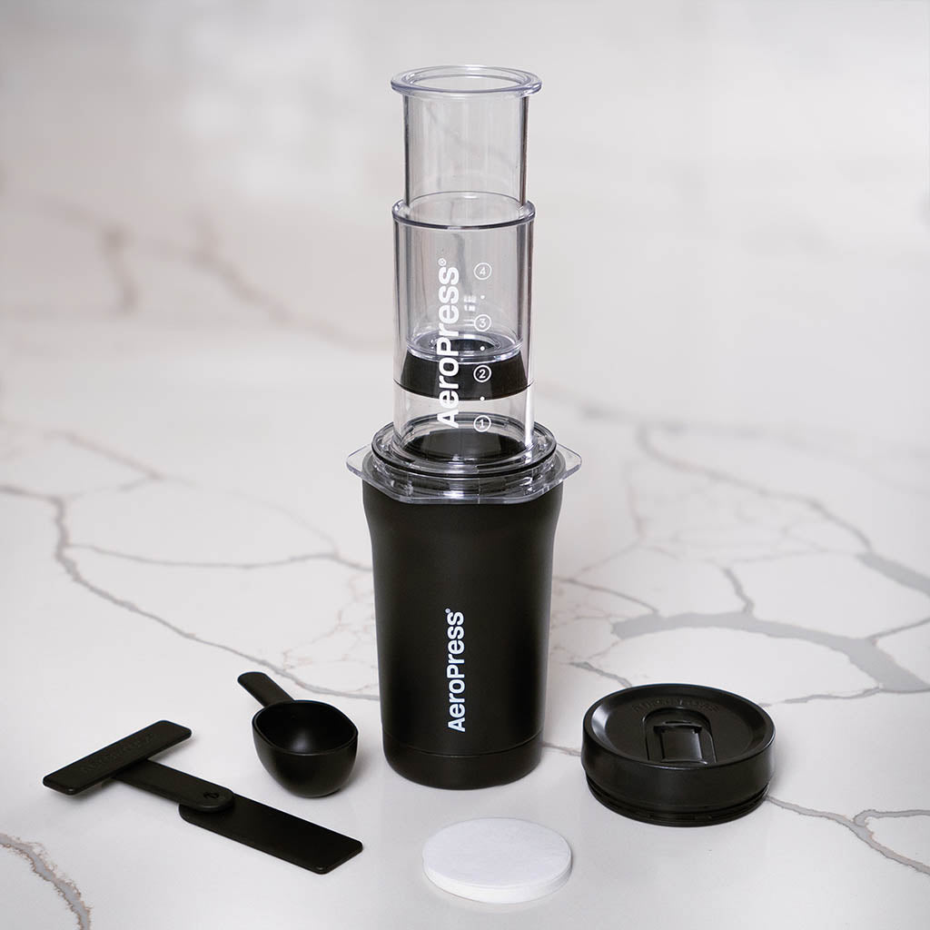 • Die modifizierte AeroPress Clear-Brühkammer passt perfekt in den Reisebecher