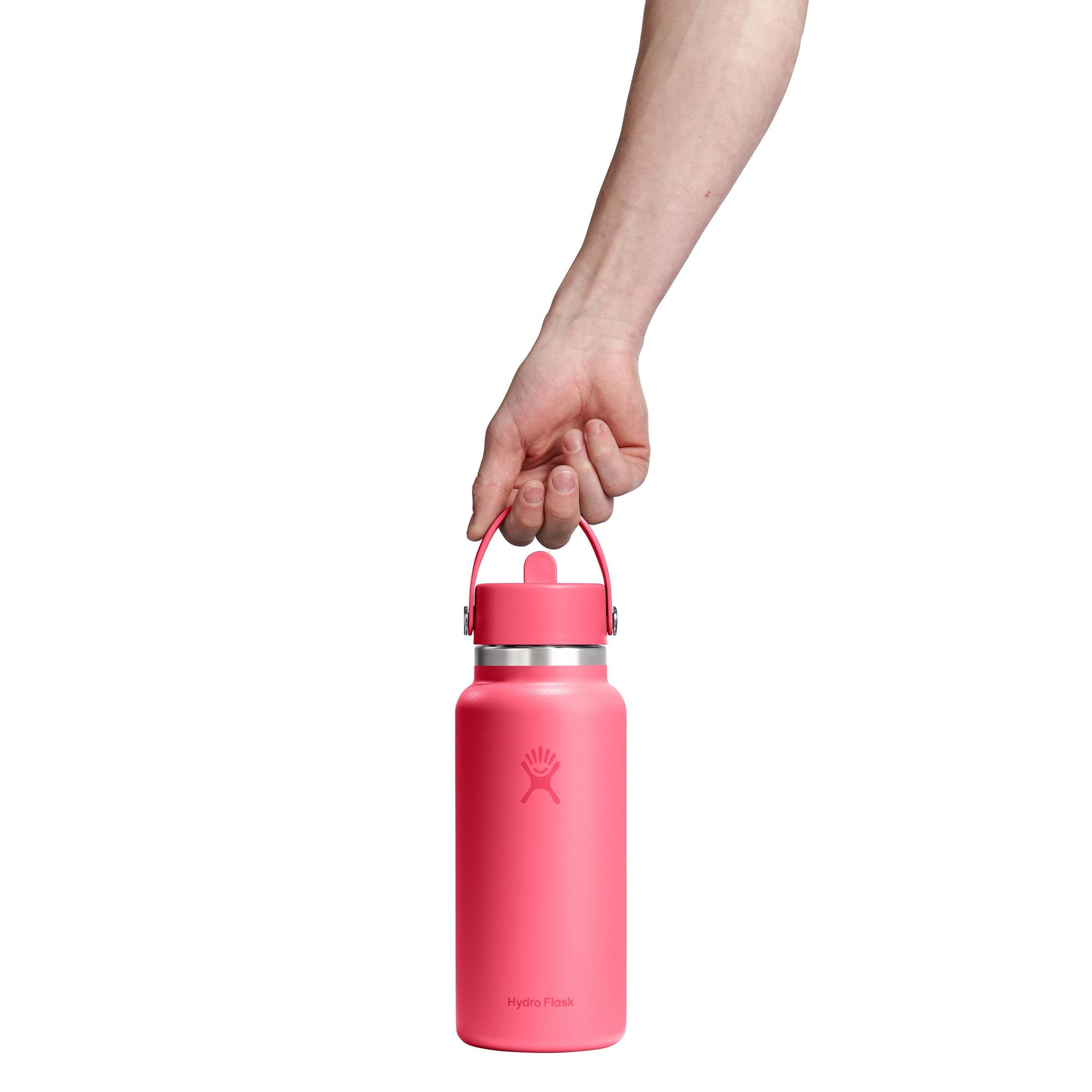 A 32 oz Wide Mouth water bottle with Hydro Flask's leakproof Flex Straw Cap — easy to fill, easy to drink. Open it up, add your ice, and flip to sip. The insulated stainless steel keeps it cold for up to 24 hours.