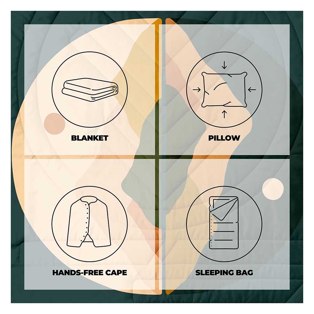 • Vielseitige 4-in-1-Decke, die auch als weiches Kissen und Umhang dient und sich sogar zu einem Schlafsack zusammenfalten lässt