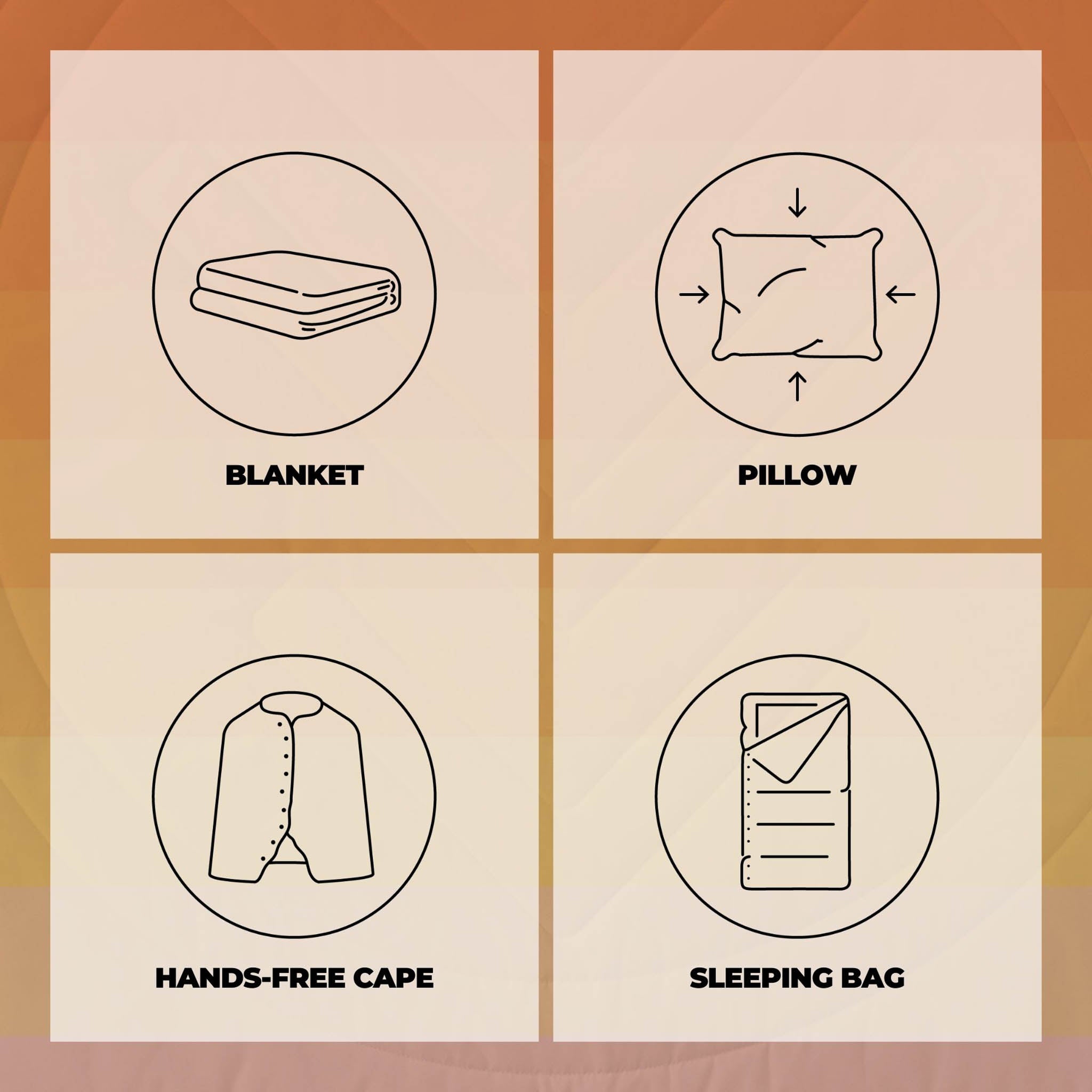 • Versatile 4-in-1 blanket that also functions as a soft pillow, a hands-free cape and even snaps together to form a sleeping bag