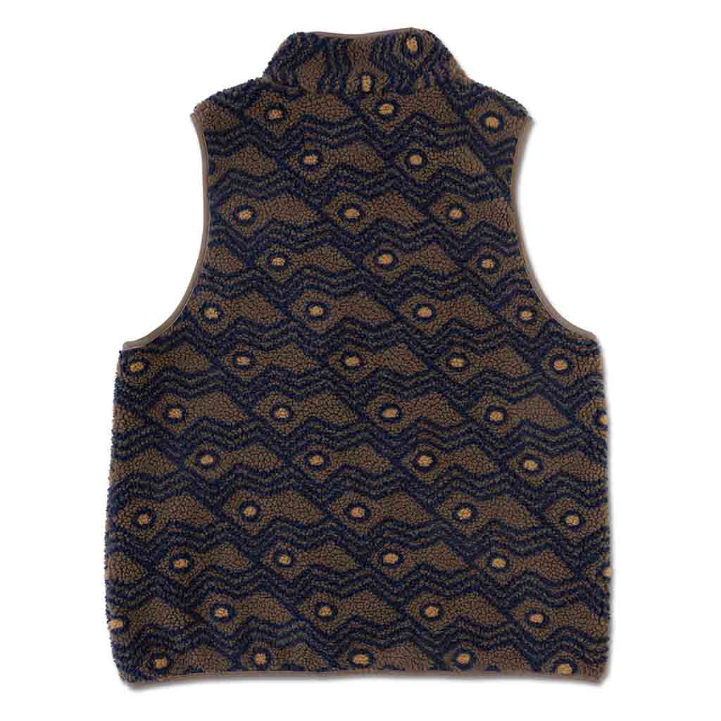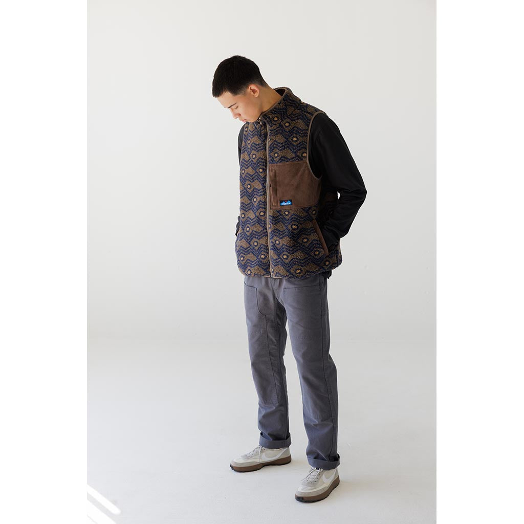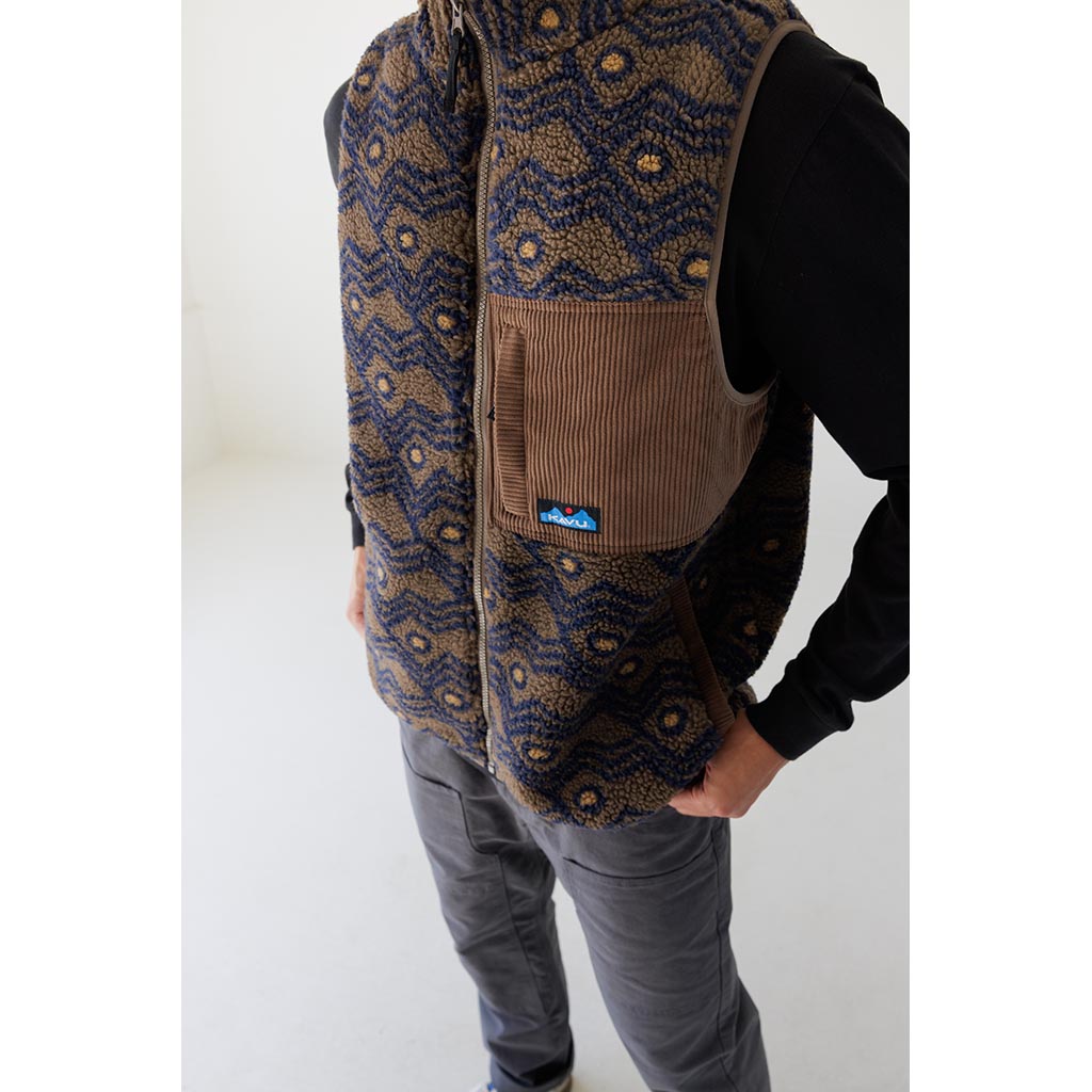 Die Cooper Weste von KAVU besteht aus einem schönen, hochflorigen Fleece, das schon beim bloßen Anblick ein wohliges Gefühl vermittelt. Aber ein Blick auf die Innenseite zeigt, dass man sich wirklich Gedanken darüber gemacht hat, was Outdoor-Fans von einer Weste für kaltes Wetter erwarten könnten. Die Vorderseite ist mit winddichtem Taft gefüttert, um zu verhindern, dass Väterchen Frost in den Oberkörper schneidet, während die Rückseite aus atmungsaktivem Polyestergewebe besteht, das besonders willkommen ist, wenn man einen Rucksack trägt. Und die Cooper sieht so gut aus, wie sie sich anfühlt, mit einer auffälligen Brusttasche aus 8-waligem Kordsamt. Die Innenseite der Knopfleiste, die Eingrifftaschen und der Nackenbesatz sind aus demselben Cordgewebe gefertigt, und am Kragen, an den Armausschnitten und am Saum befinden sich elastische Kontrastbündchen.
