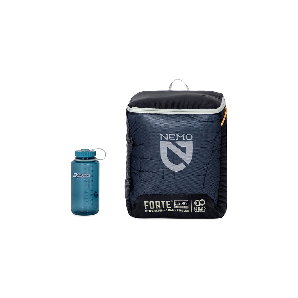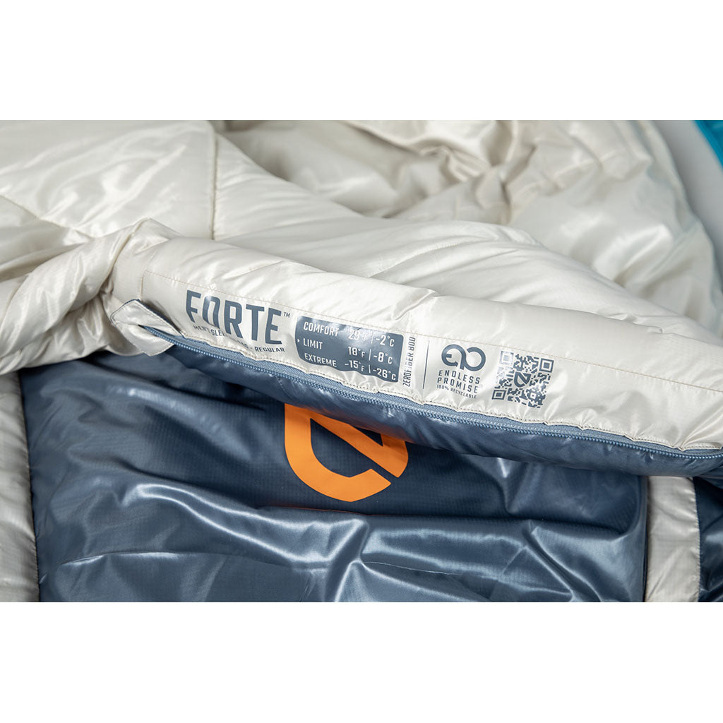 • Opposite-sided zippers on Forte men's and women's models increase versatility by allowing them to be zipped together into a double sleeping bag