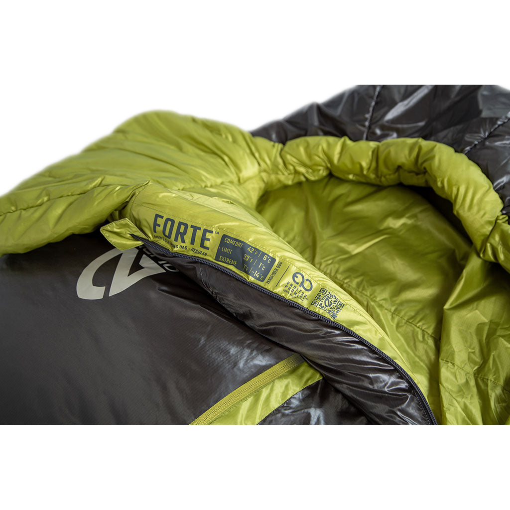 • Opposite-sided zippers on Forte men's and women's models increase versatility by allowing them to be zipped together into a double sleeping bag