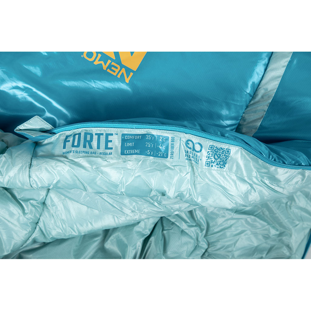• Opposite-sided zippers on Forte men's and women's models increase versatility by allowing them to be zipped together into a double sleeping bag