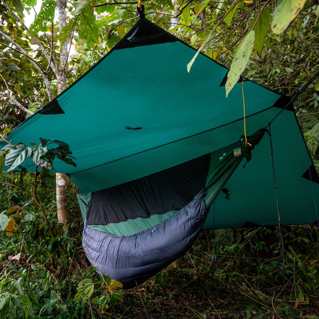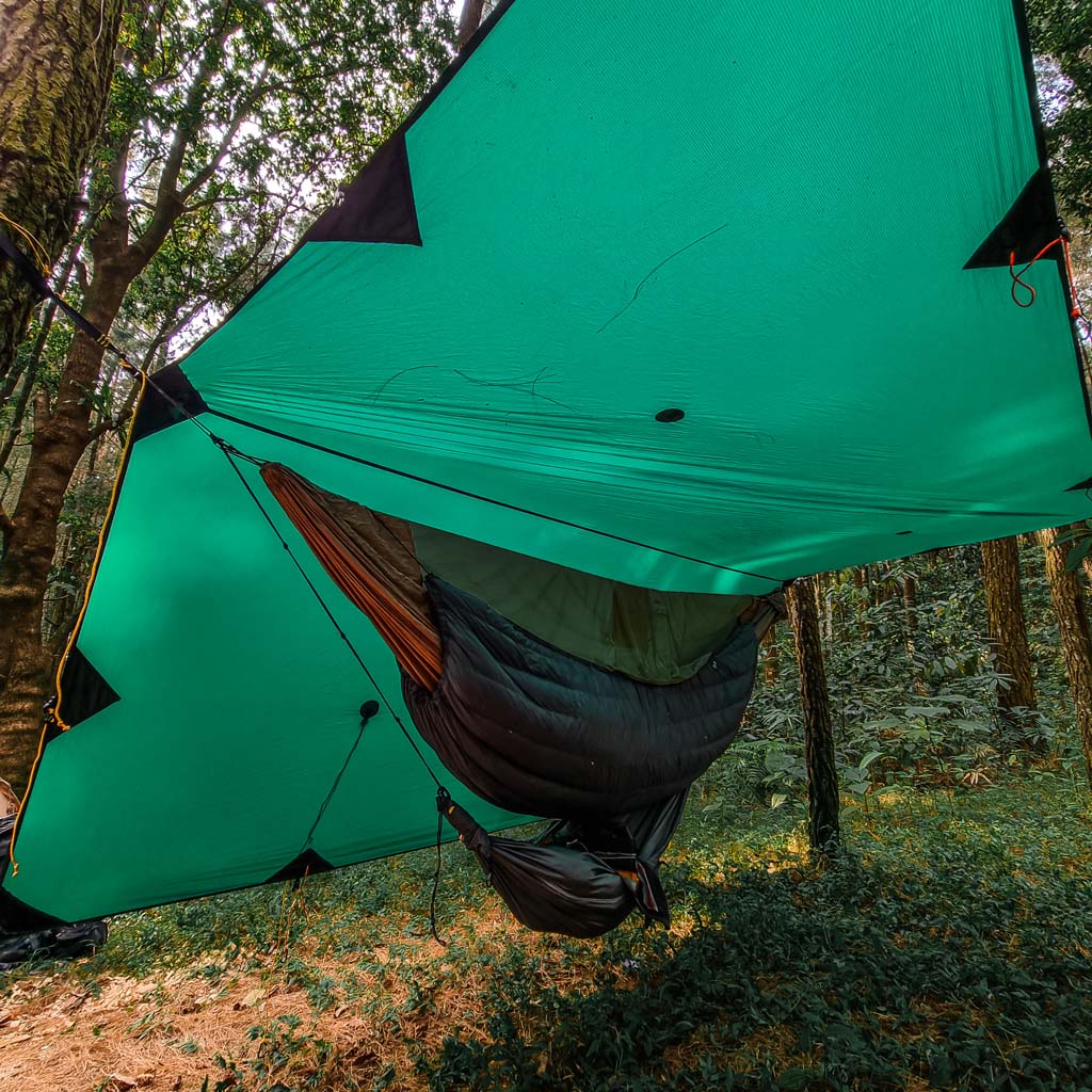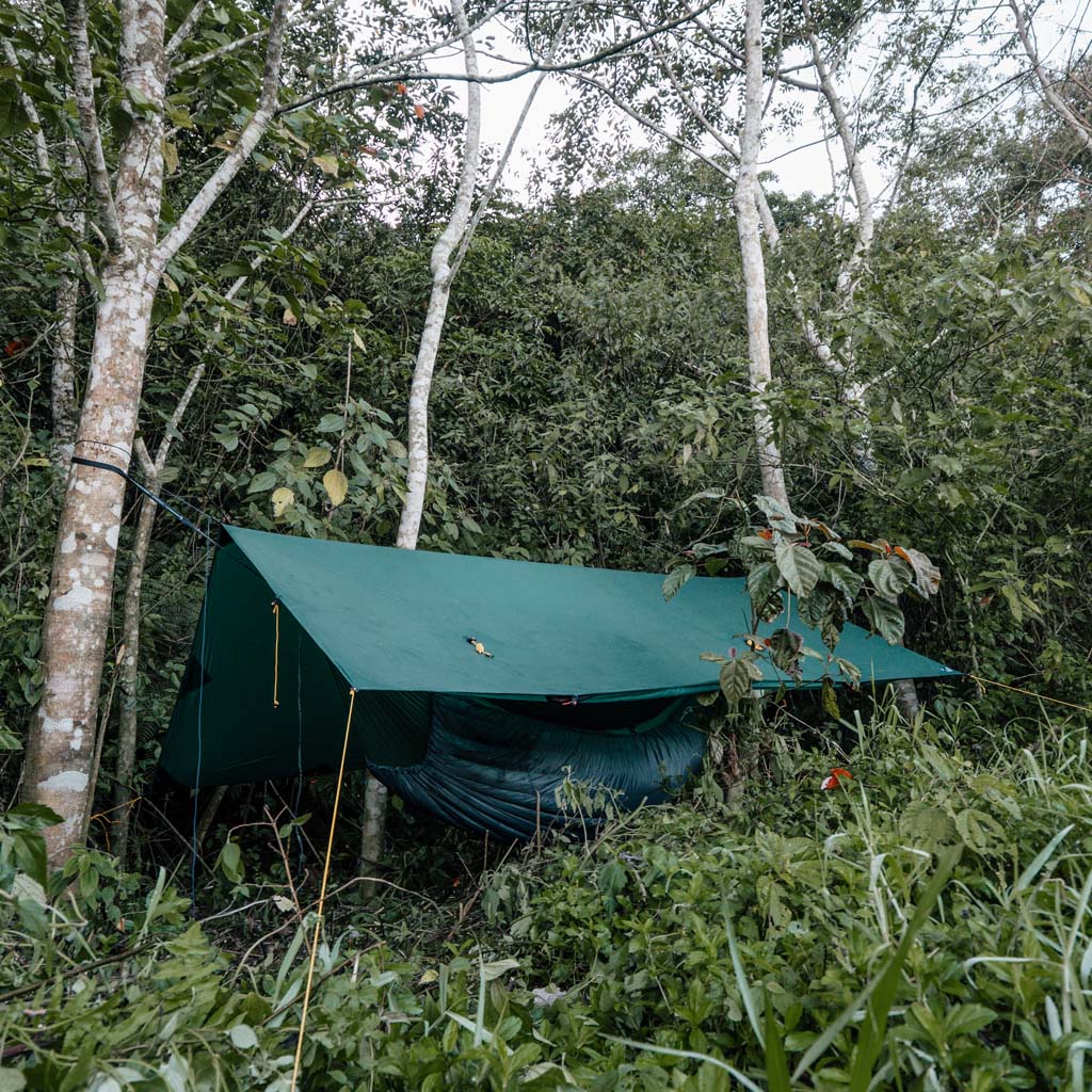 Hängemattencamping im Vereinigten Königreich kann ein bisschen wie ein Würfelspiel sein. Selbst wenn es hell und klar ist, wenn Sie einschlafen, wissen Sie nicht, ob Sie in der Nacht von einem Regenschauer geweckt werden, besonders wenn Sie im Herbst, Winter oder Frühling unterwegs sind. Aus diesem Grund empfehlen wir immer, Ihr Setup mit einem zuverlässigen Tarp zu kombinieren - und wir glauben nicht, dass es ein zuverlässigeres Tarp als das Fullmoon Tarp von Ticket to the Moon gibt. Es wurde entwickelt, um mehr Schutz vor den Elementen zu bieten, und bietet bei diagonalem Aufstellen fast 4 Meter Dachschutz, genug, um Ihr Lager fast vollständig zu umschließen. Und dank des hochwertigen 20D-Sil-Nylon-Materials ist es selbst bei stärksten Regengüssen vergleichsweise leise - damit Sie zwischen den Bäumen erholsam schlafen können.