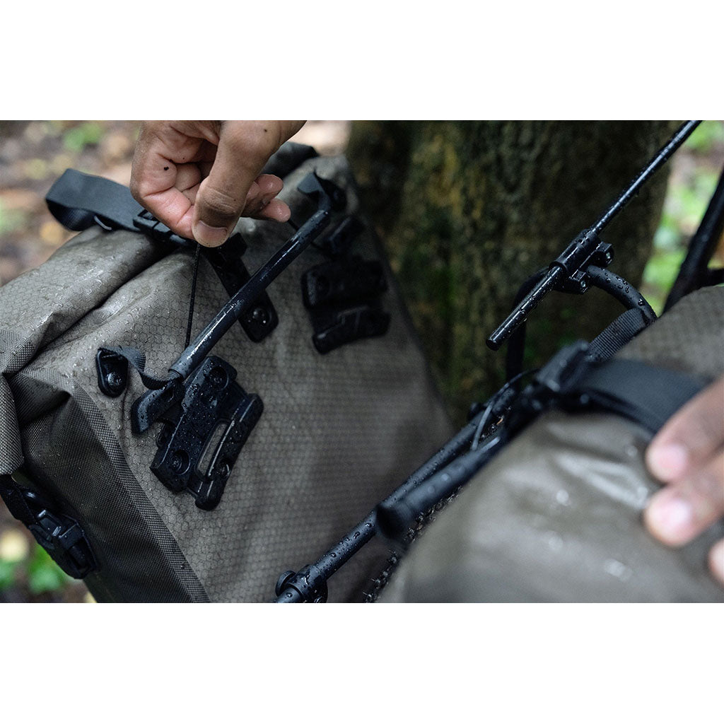 Manchmal braucht man nur auf einer Seite Kapazität, oder man baut sein Tourensetup nach und nach auf. Der Single Gravel Pack von Ortlieb nutzt das geniale QL3.1-System - Bolzen, die direkt an QL3.1-kompatiblen Gepäckträgern befestigt werden, so dass Sie die Tasche mit nur einer Hand einhängen und lösen können. Keine vorstehenden Haken auf der Rückseite bedeuten ein völlig glattes Profil an Ihrem Rahmen, und die gesamte Befestigungsvorrichtung ist leichter als herkömmliche Hakensysteme. Sie erhalten 14,5 Liter Fassungsvermögen in einer wasserdichten Ripstop-Nylonkonstruktion mit praktischen Scotchlite-Reflektoren für zusätzliche Sichtbarkeit auf Straßenabschnitten. Und das alles bei einem Gewicht von knapp über 500 g. Die Tasche wird mit QL3.1-Bolzen geliefert; wenn Ihr Gepäckträger nicht QL3.1-kompatibel ist, benötigen Sie das optionale Befestigungskit.