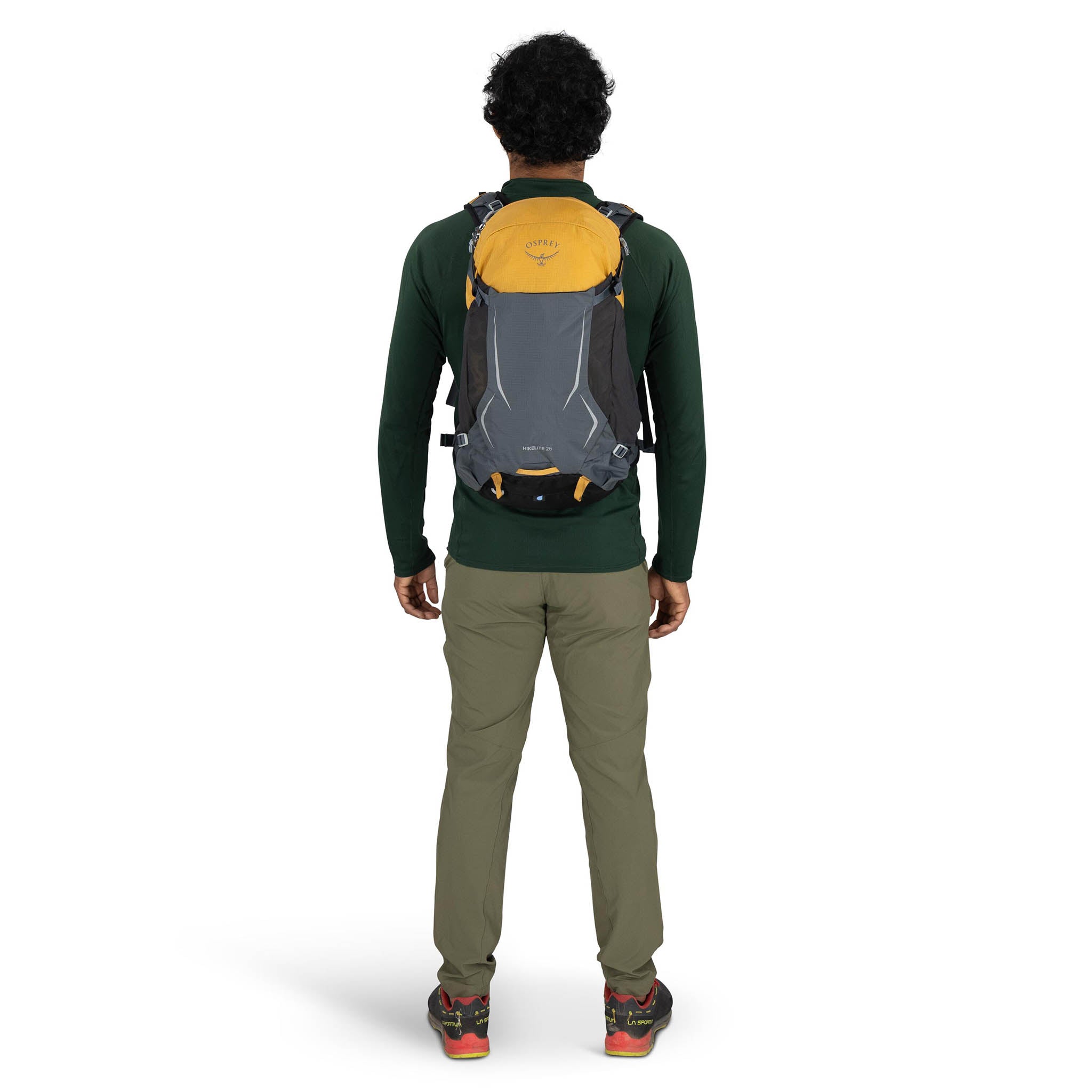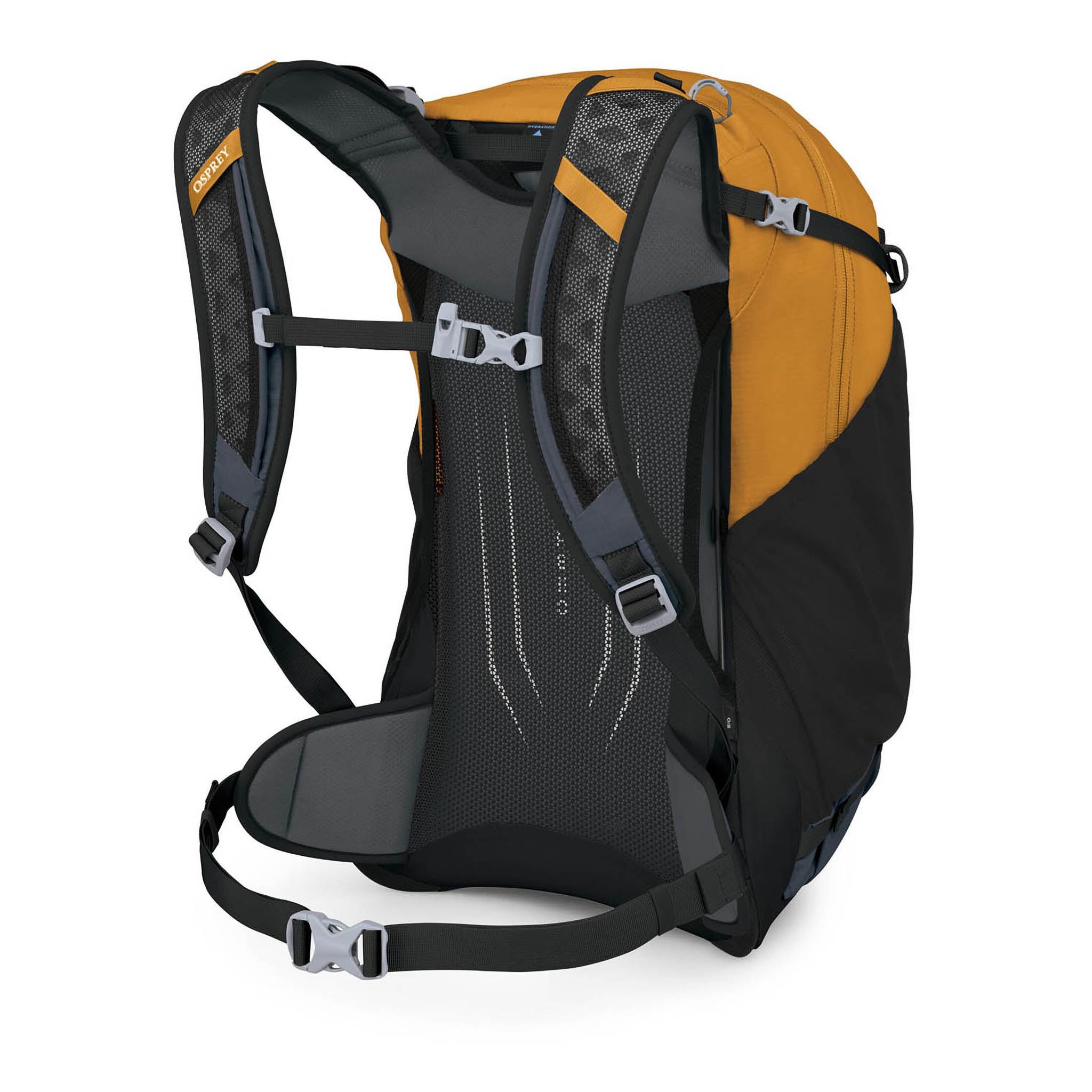 • Dual trekking pole loops + Internal reservoir sleeve with hose port in backpanel and Osprey Hydraclip for easily hanging a reservoir
