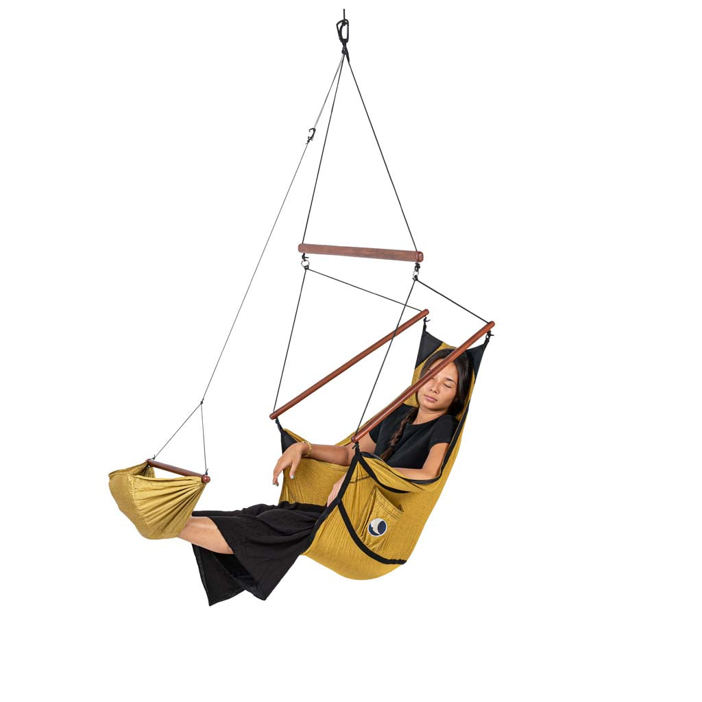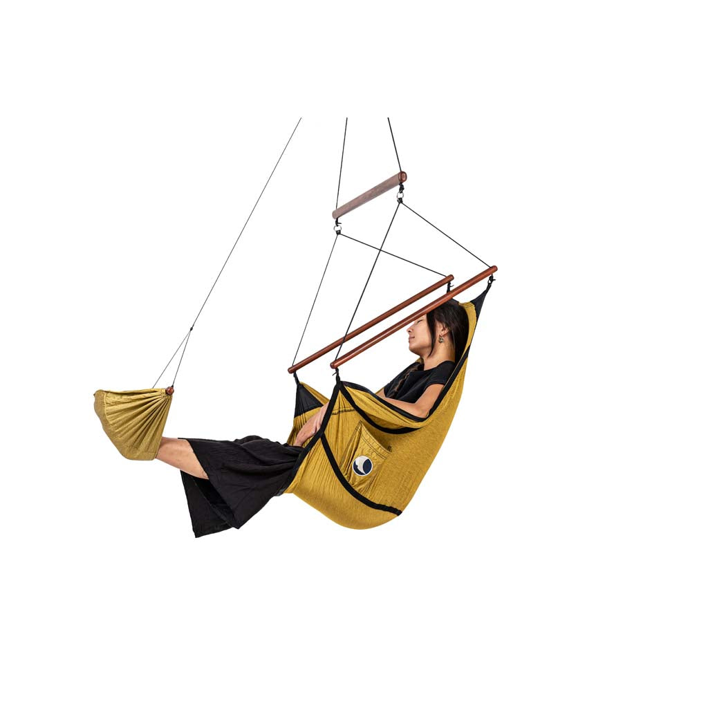 Dieser Hängesessel mit Sitz aus Seidennylon und polierten Teakholzstäben trägt die Handschrift von Ticket to the Moon: eine saubere Verarbeitung von Hand für optimalen Komfort im Garten und im Haus. Die Fußstütze, die bequem in Ihrem Sessel installiert werden kann, garantiert Wohlbefinden und totale Entspannung.