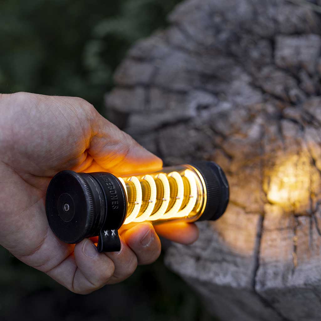 Der Edison Light Stick von Barebones sieht aus wie aus einem retro-futuristischen Videospiel - aber er ist auch bemerkenswert praktisch für den Einsatz im Freien. Das Vintage-inspirierte, gewundene LED-Lichtband macht es zu einer großartigen Mini-Laterne oder Zeltlampe, während die weißere Taschenlampe gut als Notfall-Taschenlampe funktioniert. Du kannst sie auf das Ende stellen oder an dem kleinen Riemen aufhängen. Sie wird über ein Standard-USB-C-Kabel aufgeladen, und es gibt auch einen praktischen USB-C-Ausgang, über den du im Notfall dein Smartphone über den Lichtstab mit Strom versorgen kannst. Für eine so kleine Lampe ist die Akkulaufzeit hervorragend, vor allem, weil es sieben verschiedene Beleuchtungsmodi gibt, mit denen du Stromverbrauch und Atmosphäre ausgleichen kannst. In der stärksten Einstellung für die Laterne sind es etwa 4,5 Stunden, während die Verwendung als Taschenlampe im Energiesparmodus für satte 70 Stunden Beleuchtung sorgt.