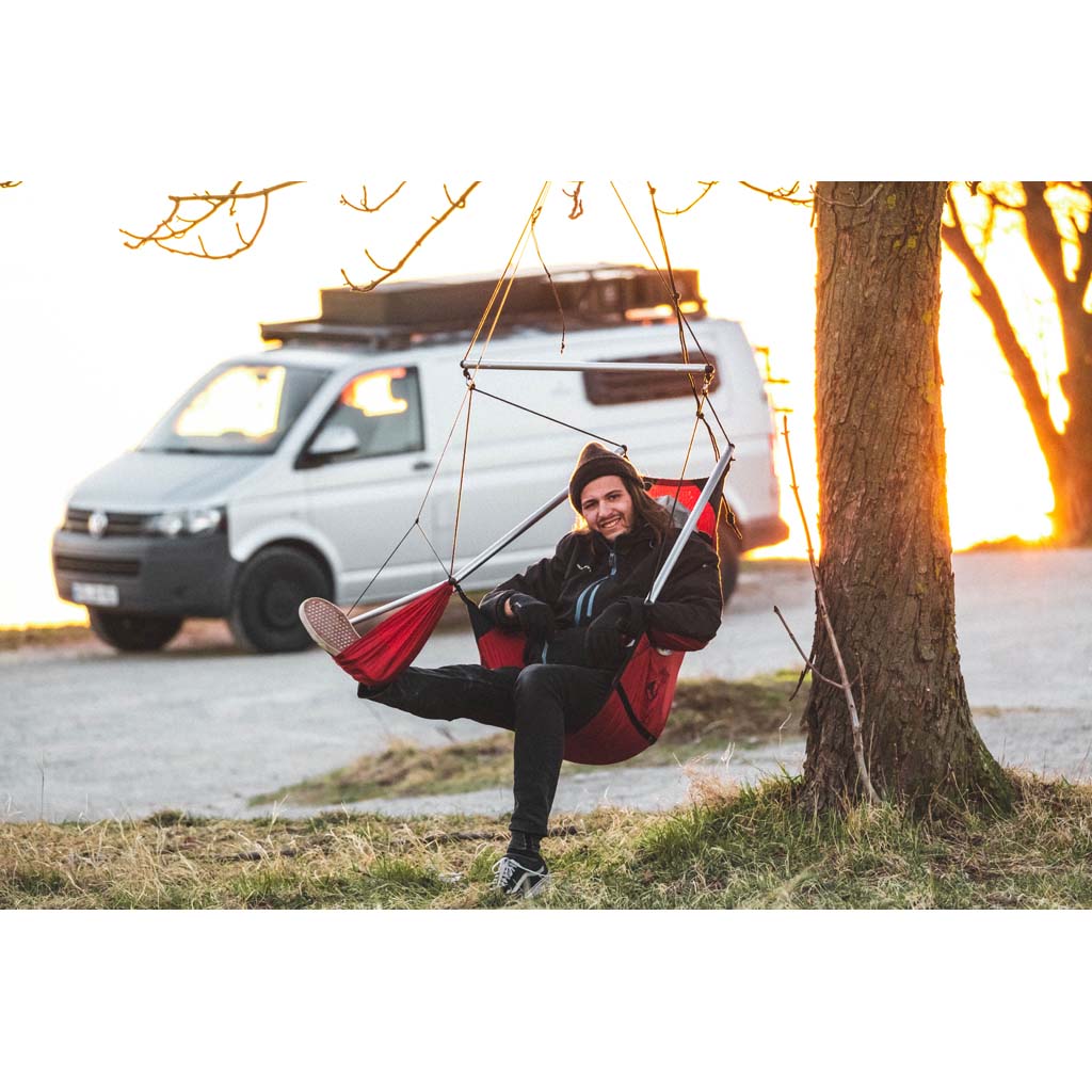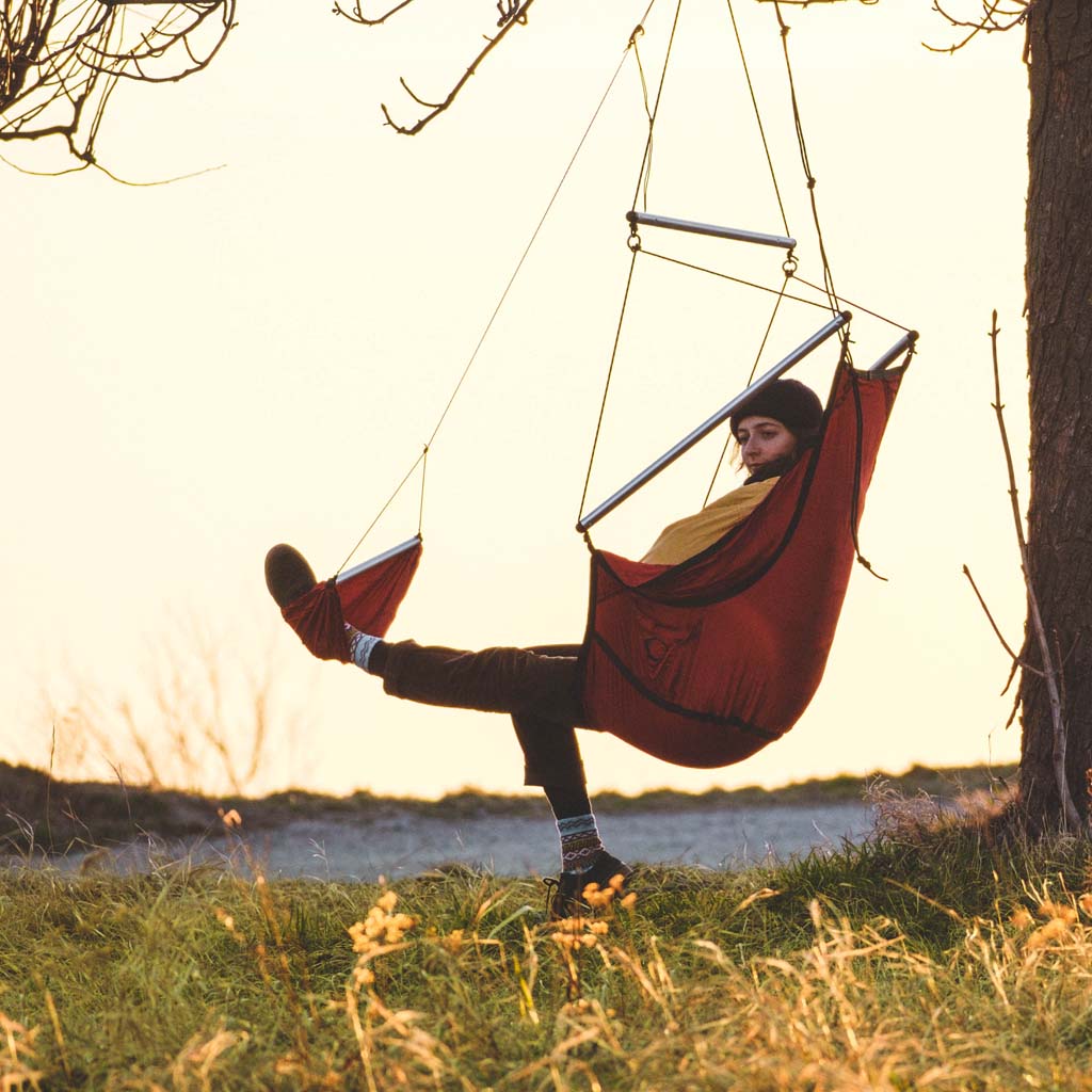 Der Moonchair der entspannten balinesischen Marke Ticket to the Moon sieht ein bisschen aus wie Batmans Sessel. Er ist nicht nur das Nonplusultra in Sachen Komfort auf dem Trail oder zu Hause, sondern auch ein äußerst cleveres Gerät. Er besteht aus ultraleichtem Fallschirmnylon und Aluminiumrohren und lässt sich in Sekundenschnelle aufstellen. Der Moonchair benötigt nur einen einzigen Verankerungspunkt, sodass Sie ihn so ziemlich überall aufhängen können, wo Sie einen Ast oder Balken haben. Für uns ist das wirklich Geniale die schwebende Fußstütze, die die Dekadenz irgendwie auf die nächste Stufe hebt.