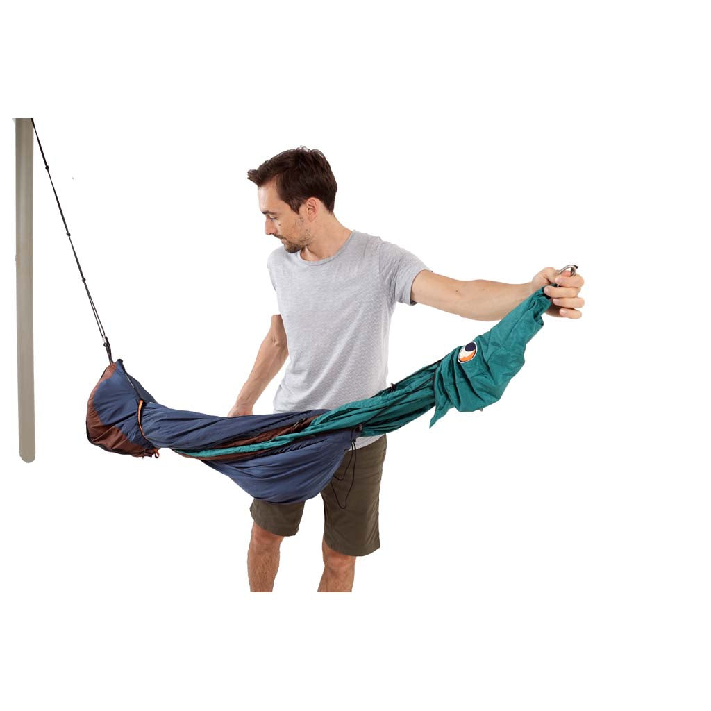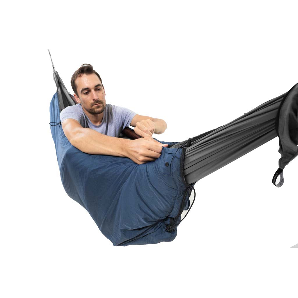Wenn Sie schon einmal eine Nacht in einer Hängematte verbracht haben, wissen Sie, wie wichtig ein hochwertiges Unterbett ist: Die Wärme, die sie bieten, macht ein ohnehin schon komfortables Lager noch gemütlicher, während eine Nacht ohne Unterlage zu einer sehr kühlen Nacht zwischen den Bäumen führt. Aber was ist, wenn Sie in der Nähe des Lagers abhängen oder Ihr Hängemattenabenteuer mangels Bäumen mit einer Nacht in einem Zelt unterbrechen? Hier kommt der Moonquilt von Ticket to the Moon ins Spiel, ein vielseitiger und ultrakuscheliger Underquilt, der auch als Schlafsack oder Decke für den Gebrauch außerhalb der Hängematte verwendet werden kann. Der Moonquilt ist ideal für den ganzjährigen Einsatz bei Temperaturen um 5 °C oder wärmer und ist leicht und einfach zu transportieren - perfekt, um jedes Abenteuer, das Sie von nun an unternehmen, mit einer Extraportion Gemütlichkeit zu versehen.