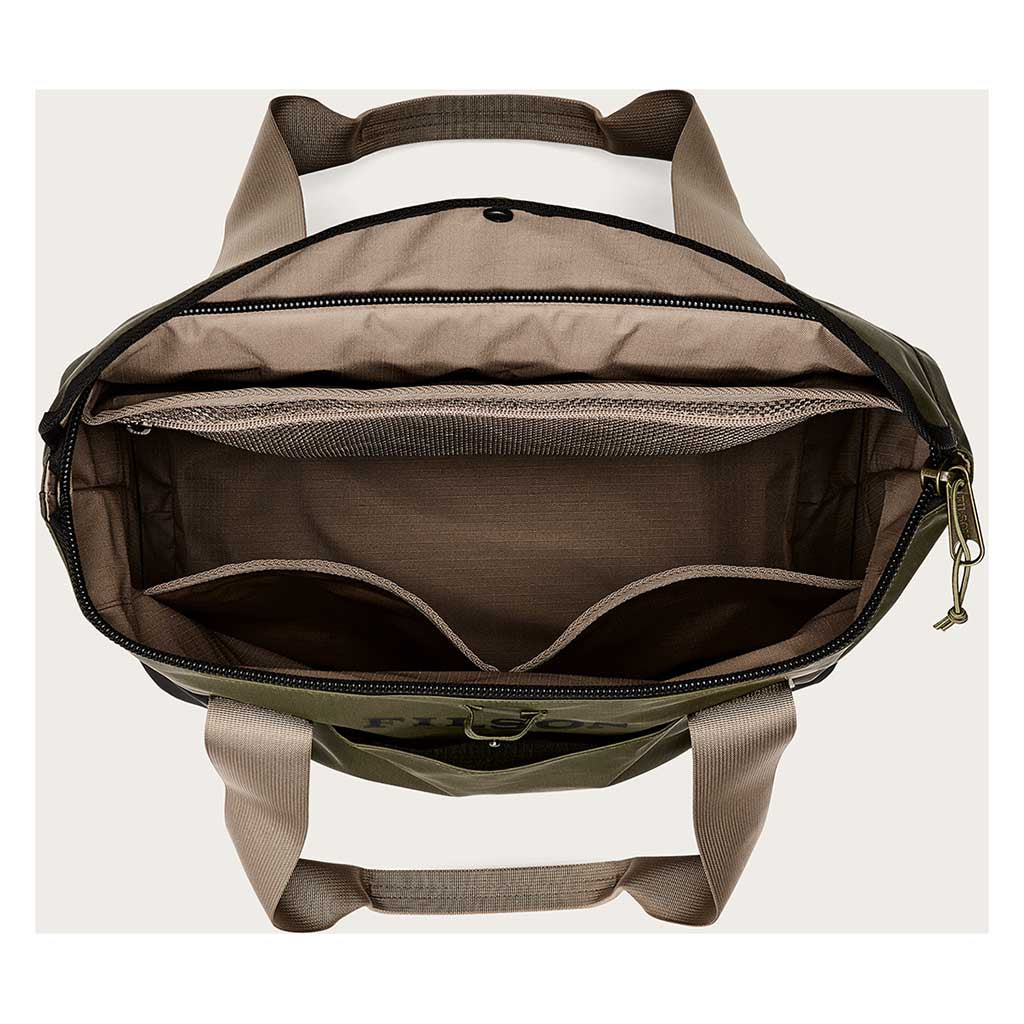 Abenteurer im amerikanischen Nordwesten verlassen sich seit mehr als einem Jahrhundert auf die Ausrüstung von Filson - und diese Alltagstasche aus der eher auf den urbanen Bereich ausgerichteten Scout-Reihe von Filson wurde mit der gleichen Verarbeitungsqualität und Liebe zum Detail hergestellt wie ihre Outdoor-Ausrüstung. Anstelle des charakteristischen gewachsten Baumwollstoffs Tin Cloth wurde ein extrem wetterfester, TPU-beschichteter Polyesterstoff verwendet, der zuverlässigeren Wasserschutz für die mitgeführte Elektronik bietet und durch eine umklappbare Schnapplasche zum Schutz des oberen Reißverschlusses verstärkt wird. Außerdem wurde der Boden für zusätzliche Haltbarkeit mit schwererem Material verstärkt. Die langen Tragegriffe aus Gurtband liegen bequem in der Hand oder über der Schulter, und die Tasche bietet viel Platz für ein gepolstertes Laptopfach, ein Netzfach mit Reißverschluss und ein Außenfach.