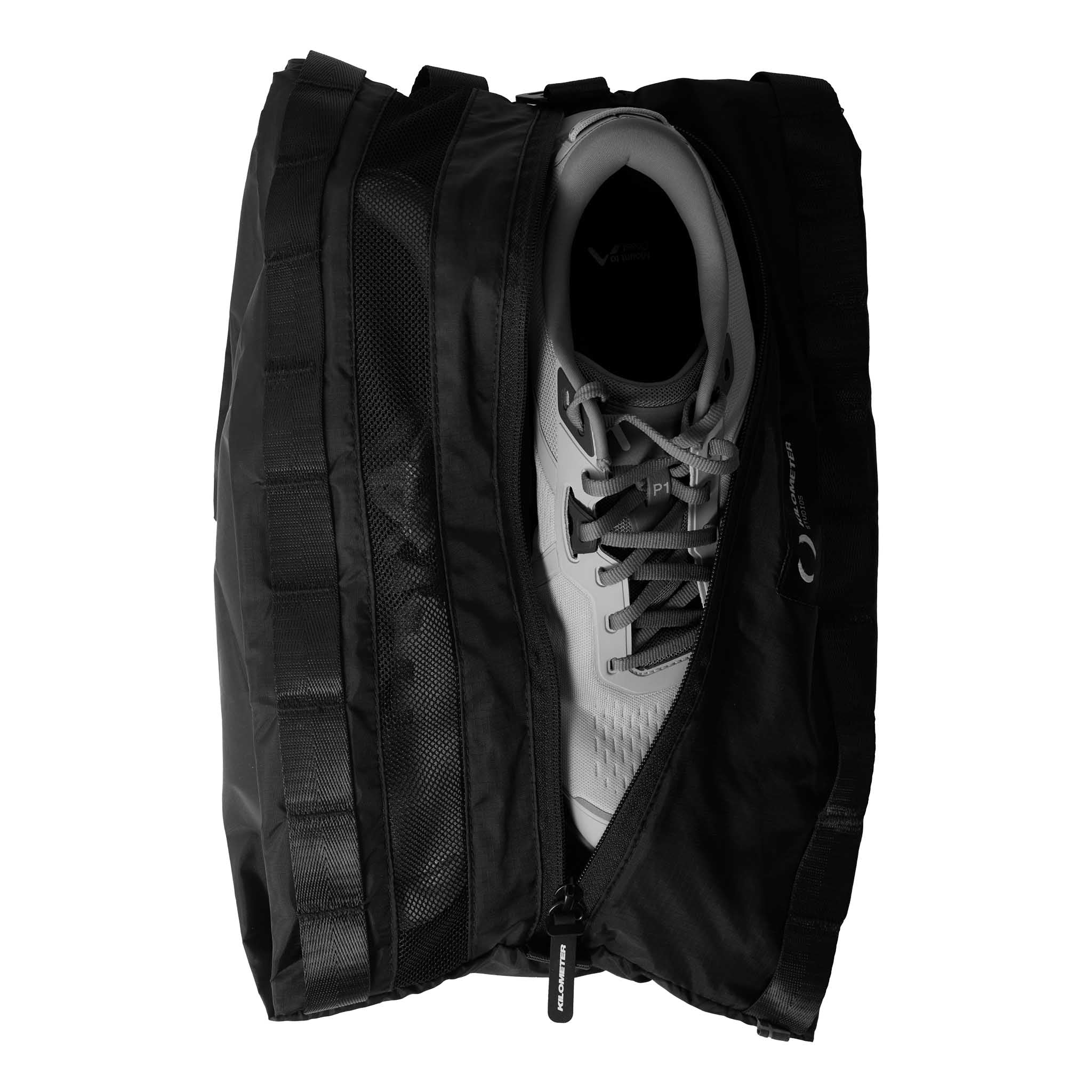 The Space Bag is purpose-built for athletes who need extra capacity without sacrificing stability or comfort. Designed to integrate seamlessly with Kilometer’s MOLLE architecture, it adds a dedicated 9L of storage for shoes or bulky gear while maintaining clean organisation inside your main pack. The precision-engineered shoe compartment keeps mud, sweat and road grit separate from everything else, and the recycled polyester construction keeps weight impressively low at just 115g. Built to stay stable during movement, it carries more of what you need — without throwing off your pace.