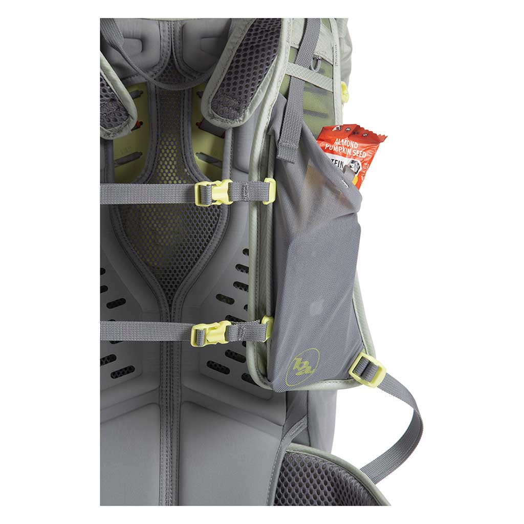 Ausgestattet mit einer übergroßen Schnellverschlusstasche aus Stretch-Mesh an der Vorderseite, den Seiten und den Brustgurten zur einfachen Aufbewahrung