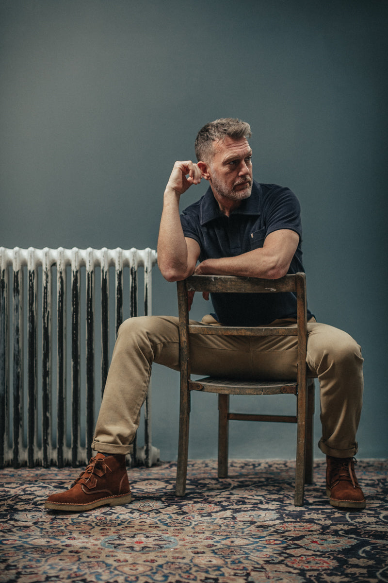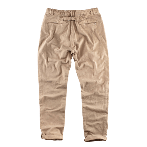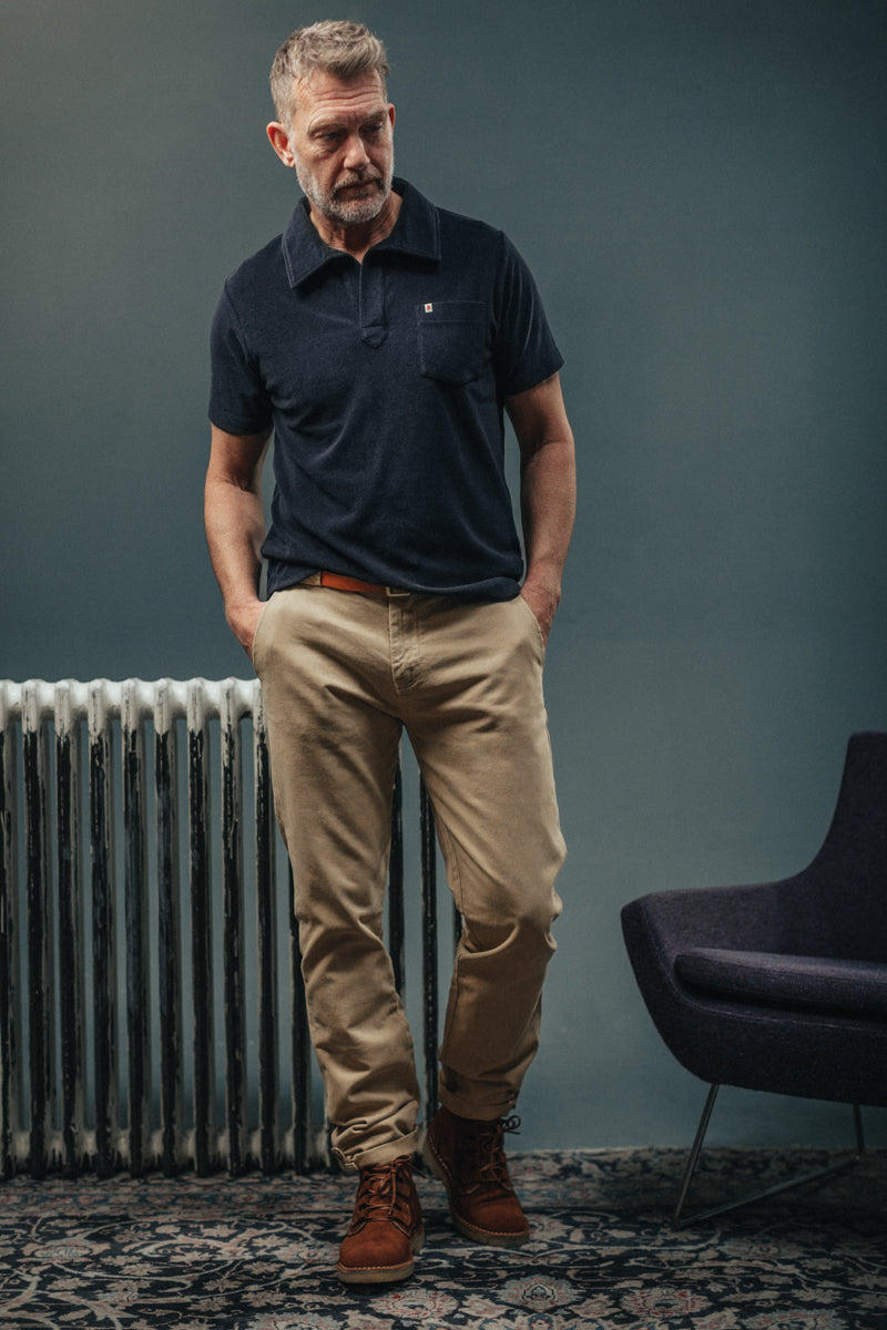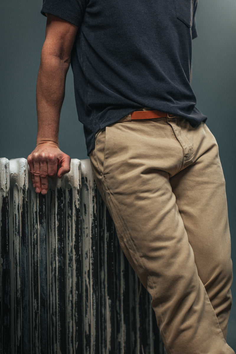 Der Aufbau und die Verarbeitung erinnern eher an eine Zimmermannshose, mit schrägen Taschen, Taschenschlaufe und einer schwereren Baumwolle als bei traditionellen Chinos. Dies verleiht der Hose ein robustes Workwear-Finish, jedoch mit dem Schnitt und dem Stil des kultigen Designs.