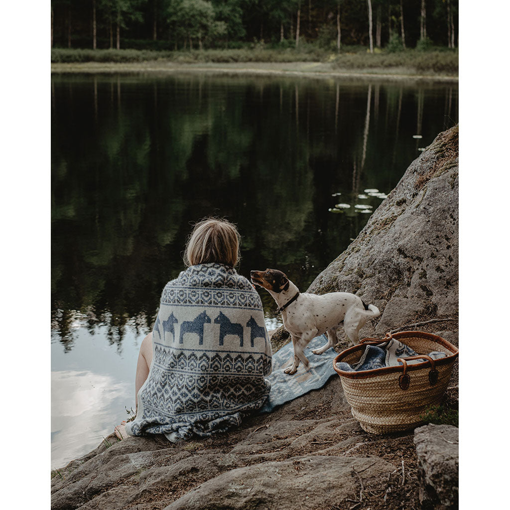 Dazu gehört auch Dalarna, eine Grafschaft im schwedischen Kernland Svealand. Es ist eine Landschaft mit grünen Tälern, unberührten Seen, grünen Wäldern und Obstplantagen - vielleicht ist sie deshalb als Schwedens Apfelweinland bekannt (und die geistige Heimat von Kopparberg). Dalarna wird aber auch mit dem Dala-Pferd in Verbindung gebracht - den kleinen geschnitzten und bemalten Holzpferden, die nicht nur zu Ikonen der Region, sondern auch Schwedens geworden sind. Das Dalarna-Strickstück zeigt stolz dieses Pferdesymbol neben anderen volkstümlichen Mustern, wobei die Wolle in traditionellen Farben gefärbt wurde.