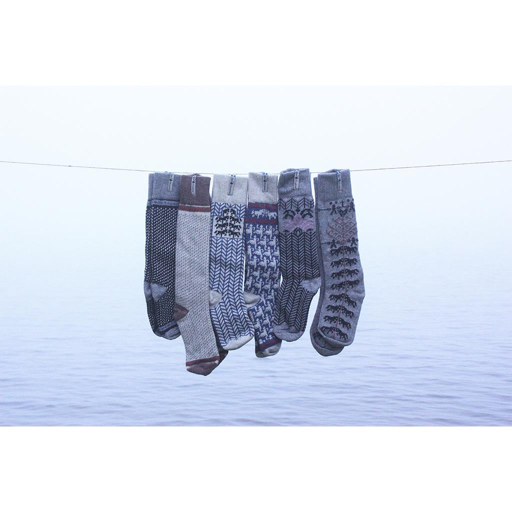 Diese Socken sind aus hochwertiger Lammwolle gestrickt, die mit etwas Nylon und Lycra für zusätzliche Festigkeit und Dehnbarkeit gemischt ist. Sie wurden entwickelt, um Ihre Füße in den kältesten und dunkelsten Wintertagen warm zu halten. Sie reichen bis knapp unter das Knie und halten Zehen, Füße, Knöchel und Waden warm. Das Ergebnis ist ein luxuriöses, kuscheliges Paar Socken, das Sie tragen können, egal ob Sie durch gefrorene Wälder wandern oder es sich am Kamin gemütlich machen.